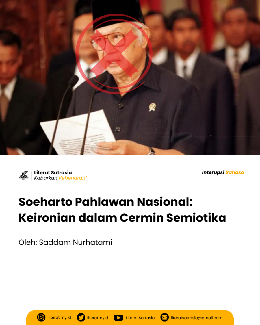 Gelar “Soeharto Pahlawan Nasional” merupakan ironi yang bertransformasi menjadi mitos baru. Dalam perspektif semiotika Roland Barthes, tanda ini bekerja sebagai sistem mitologis: penguasa otoriter dipoles sebagai penyelamat, sementara luka kolektif bangsa dikemas sebagai bagian dari pengorbanan. Di bawah bendera merah putih, mitos itu berkibar gagah, bukan untuk mengenang jasa, melainkan menutupi dosa.